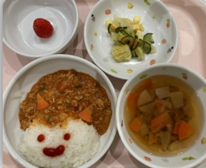 節分の日の給食メニューは「おにのキーマカレー」。おにの顔を壊さないように慎重に食べるお友だち、先に顔のパーツから食べ進めるお友だちとそれぞれに楽しみながら食べていました。
