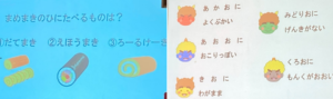 今年は南南東を向いて食べると良いこと、食べ終わるまでおしゃべりをせず心の中で願い事を唱えながら食べることを教わると、皆、静かに黙々と食べていました。