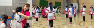 3〜5歳児は元気いっぱいに「ツバメ」を踊り、鳴子を持ち友だちと息を合わせて表現する
