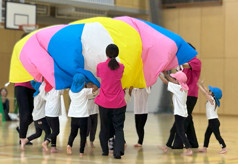 会場いっぱいに広がる大きな布で「パラシュート」や「メリーゴーランド」など力を合わせ