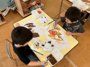 色の雰囲気から、どんぐりなどの木の実や秋の草花など秋を感じ取って描く子ども。好きな電車を描く子ども、筆を使うことを楽しむ子どもなど、秋の色味を使って一心に描く姿が見られました。