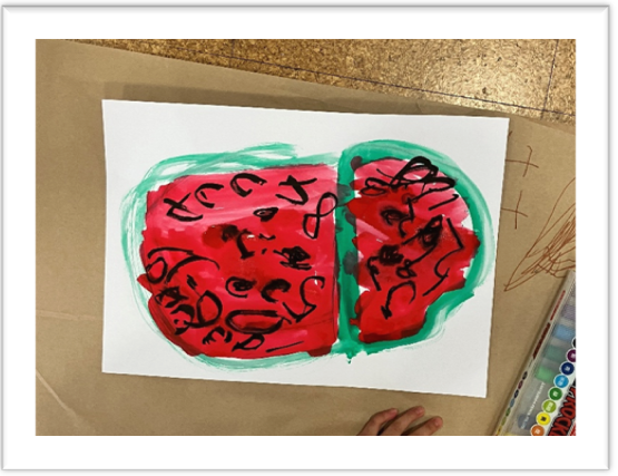 スイカの絵を描いたお友だちは「種をかかないと」と、黒のマジックを手に取り、気づけば数字まで描き込んで、すっかり芸術作品に。子どもの発想の豊かさに、保育士も思わず笑顔になりました。