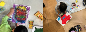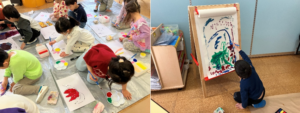 描きあがった絵を飾ったり乾かしてると「これはね、お花と虹だよ」「恐竜かいたんだ」とあちらこちらから誇らしげな声が聞こえてきました。自分の作品を見てもらえる喜び、友だちと共有する楽しさが広がり、保育室はまるで小さな美術館のようでした。