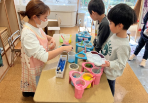 絵具コーナーでは、梅鉢パレットを手にし「赤ください あとはね、緑」 「あっ! 青も欲しい」と好きな色をスプーンで入れてもらいながら選んでいました。保育士は、子どもたちが自分で選び、自分で決める経験を大切にしながら、「この色もきれいだね」「混ぜたらどんな色になるかな」など、表現を広げる声かけを行いました。